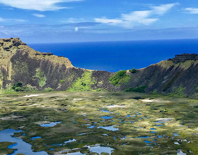 Este recorrido incluye la visita al centro ceremonial de Orongo, nacimiento de la cultura del hombre pájaro, siguiendo con la visita al inmenso cráter del volcán Rano Kau ...